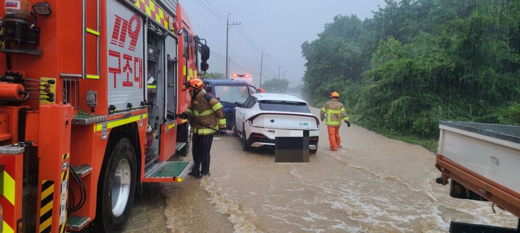 17일 호우경보가 내려진 경북 청도군 청도읍 원리 일대 도로가 침수돼 소방 당국과 경찰이 현장 조치를 하고 있다. 연합뉴스