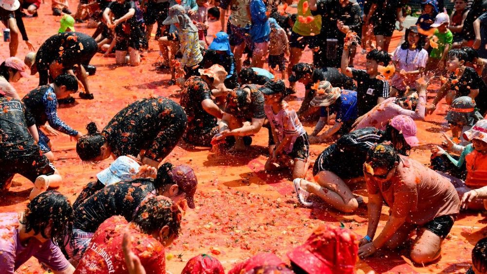 2024년 8월3일 화천 토마토 축제 참가자들이 황금반지를 찾고 있다. 화천군