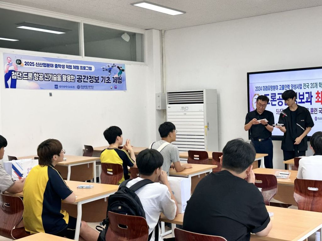 ‘신산업분야 중학생 직업 체험 프로그램’에 참가한 학생들이 드론 항공기술을 활용한 공간정보 기초 교육을 받고 있다. 광주시교육청 제공