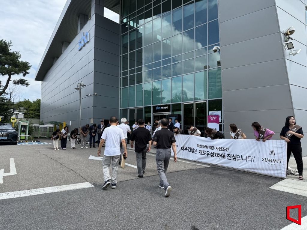 이날 서울 강남구 대치동 세텍 컨벤션센터에서는 설명회를 들으러 온 조합원들로 발 디딜 틈이 없었다. 늦게 도착한 조합원들은 간이 의자나 계단에 앉아서 설명을 듣기도 했다. 행사장 입구부터 시공사 홍보요원들이 두 줄로 도열해 대형 현수막을 펼쳐 들고 '안녕하십니까, 열심히 하겠습니다'라며 조합원들에게 큰 목소리로 인사했다.