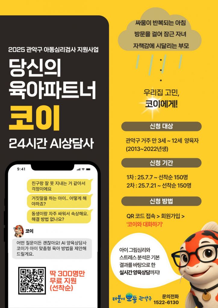 이 사업은 '2025년 관악구 아동그림심리검사 지원사업'의 일환으로 올해 처음 도입됐다. 구는 인공지능 상담사가 간단한 대화만으로도 부모의 감정을 공감하고 조언을 제공해 부모들의 육아 고민을 쉽게 해소할 수 있을 것으로 기대하고 있다.