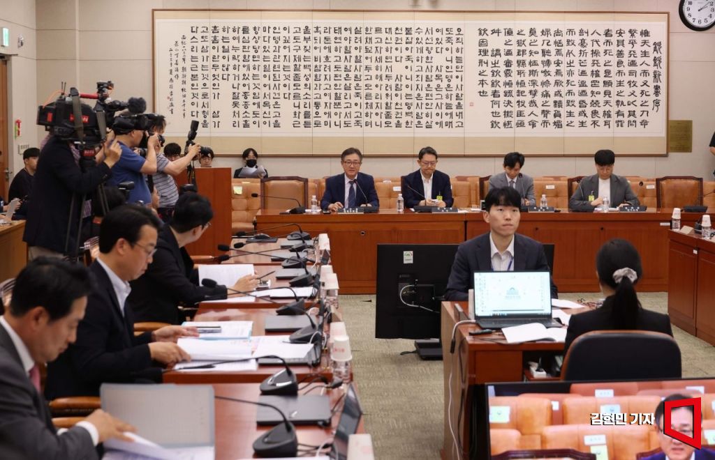 11일 국회 법제사법위원회 법안심사제1소위원회에서 열린 상법 추가 개정을 위한 공청회에서 정우용 한국상장회사협의회 정책부회장이 진술하고 있다. 왼쪽부터 정우용 한국상장회사협의회 정책부회장, 김우찬 고려대 교수, 최준선 성균관대 법학전문대학원 명예교수, 윤태준 주주행동플랫폼 액트 소장. 2025.7.11 김현민 기자