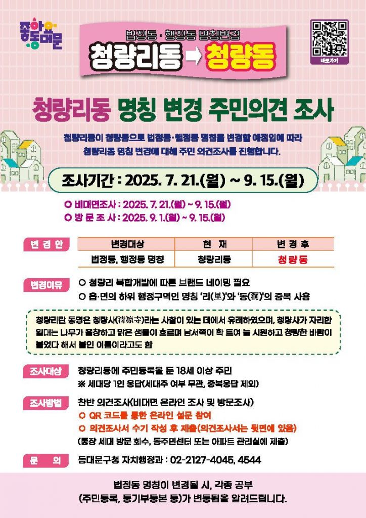 이번 조사는 청량리 복합개발로 인해 변화된 지역 현실을 반영해 동 명칭을 보다 간결하고 상징성 있는 '청량동'으로 변경하자는 주민들의 지속적인 요청에 따라 추진하는 것이다.