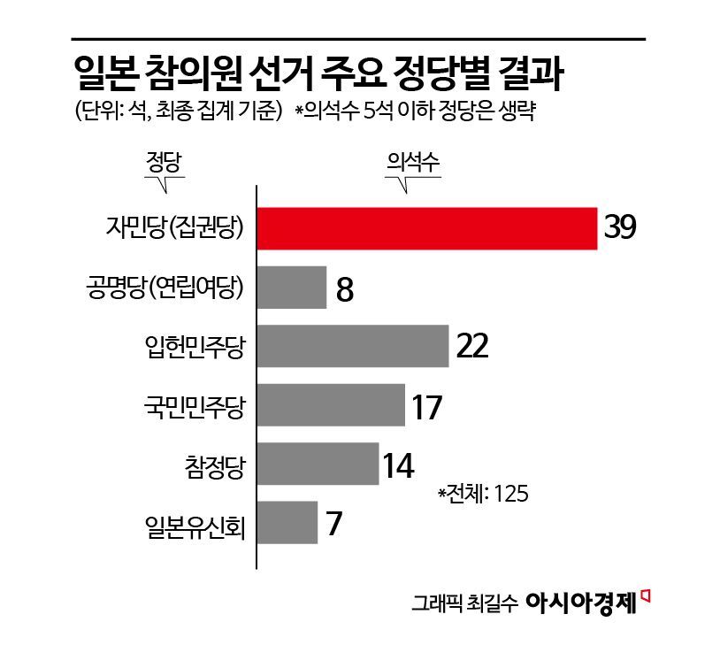 21일 NHK방송, 니혼게이자이신문(닛케이신문) 등에 따르면, 이번 선거 최종 집계에서 집권당인 자민당은 39석, 연립여당인 공명당은 8석을 확보하는 데 그쳤다. 중의원(하원)에 이어 참의원(상원)에서도 모두 '여소야대' 구도가 형성된 것이다. 당초 NHK 출구조사에서 자민당은 27~41석, 공명당은 5~12석을 얻을 것으로 예상됐다.
