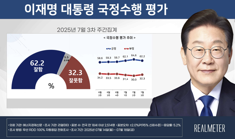 리얼미터가 에너지경제신문 의뢰로 지난 14∼18일 전국 만 18세 이상 유권자 2514명을 대상으로 조사한 결과에 따르면 이 대통령의 지지율은 지난 조사보다 2.4%포인트 하락한 62.2%를 기록했다.