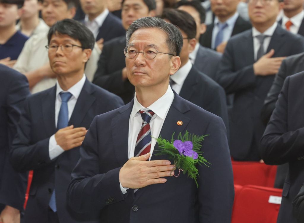 정성호 법무부 장관이 21일 정부과천청사에서 열린 취임식에서 국기에 경례하고 있다. 연합뉴스