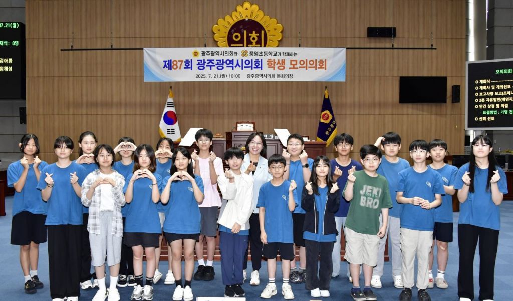 광주시의회는 21일 오전 10시 시의회 본회의장에서 풍영초등학교 학생 19명이 참여한 가운데 '제87회 학생 모의의회'를 개최했다. 광주시의회 제공