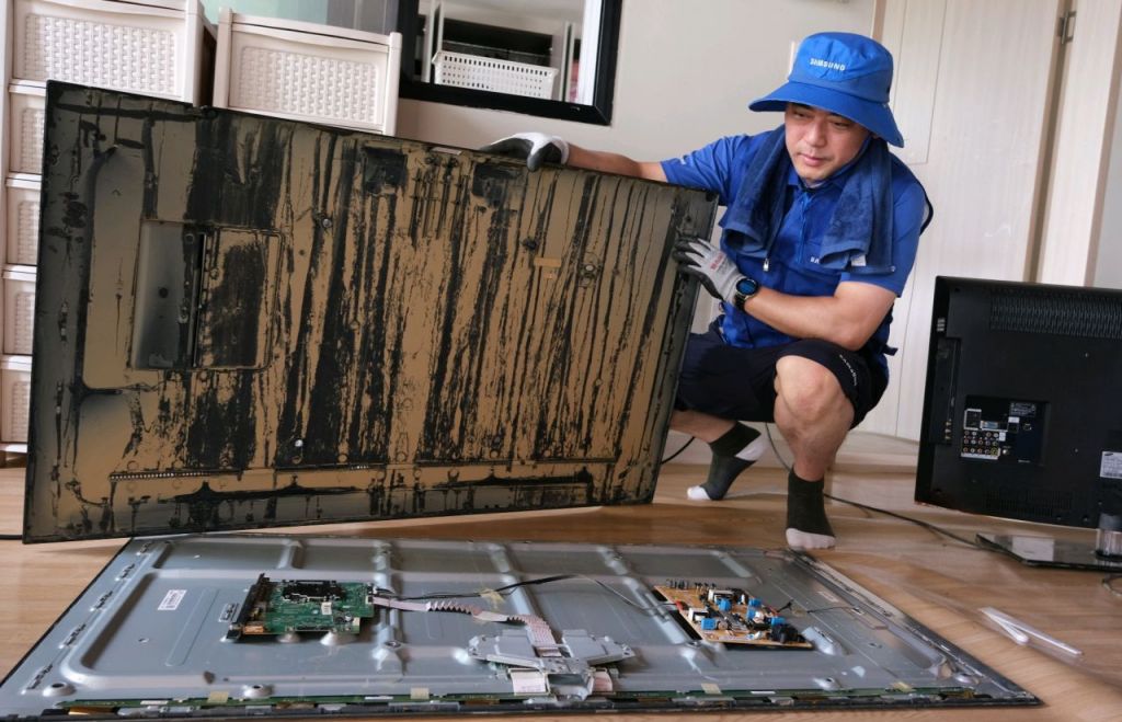 지난 18일 충청남도 예산군 삽교읍에서 삼성전자서비스 엔지니어가 수해 복구 특별 점검 서비스를 실시하는 모습. 사진=삼성전자서비스