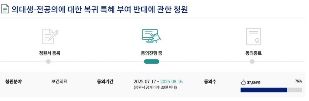 의정 갈등으로 학교와 수련병원을 이탈한 의대생과 전공의들의 복귀 움직임이 본격화되는 가운데 이들에게 특혜를 주면 안 된다는 취지의 국민청원에 3만7000명이 넘게 동의했다.
