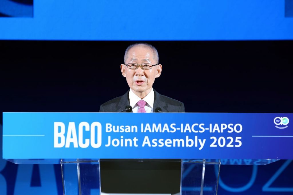 이회성 기후변화에 관한 정부 간 협의체(IPCC) 전 의장이 21일 부산 벡스코(BEXCO)에서 개막한 '2025 IUGG 기상-해양-빙권 국제학술대회(BACO-25)'에서 기조강연을 하고 있다. BACO-25 조직위원회 제공
