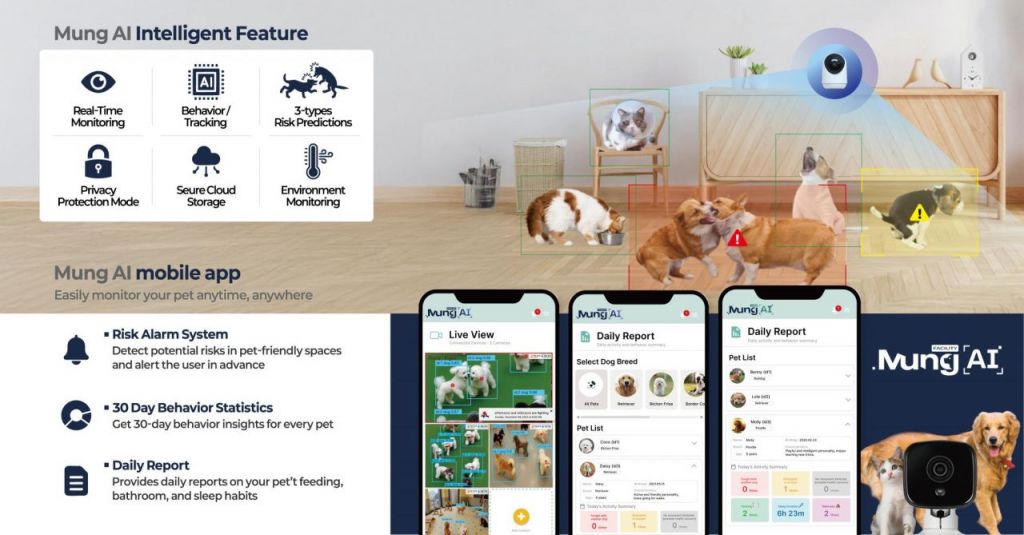 MungAI는 반려동물 동반 시설에서 발생하는 싸움, 탈출 사고와 건강 이상 징후를 CCTV 영상 기반으로 실시간 식별·예측하고 알림으로 제공하는 AI 기술이다. 또한, 가정용 펫 홈캠에는 반려동물의 수면, 식사, 활동 등 하루 일과 데이터를 자동으로 분석 및 기록하는 AI 기술이 적용돼 있다.