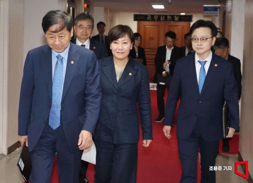 구윤철 경제부총리 겸 기획재정부장관(왼쪽)을 비롯해 김정관 산업통상자원부 장관(오른쪽), 조현 외교부 장관(왼쪽 두번째), 송미령 농림축산식품부 장관(오른쪽 두번째)이 22일 서울 종로 정부서울청사에서 열린 대미관세협상 관련 대외경제장관회의에 참석하고 있다.