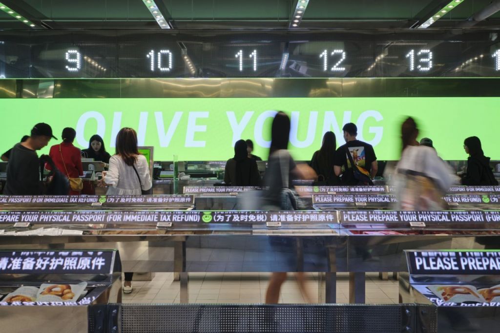 외국인 관광객들이 올리브영 명동 타운에서 계산대로 향하고 있다. CJ올리브영 제공