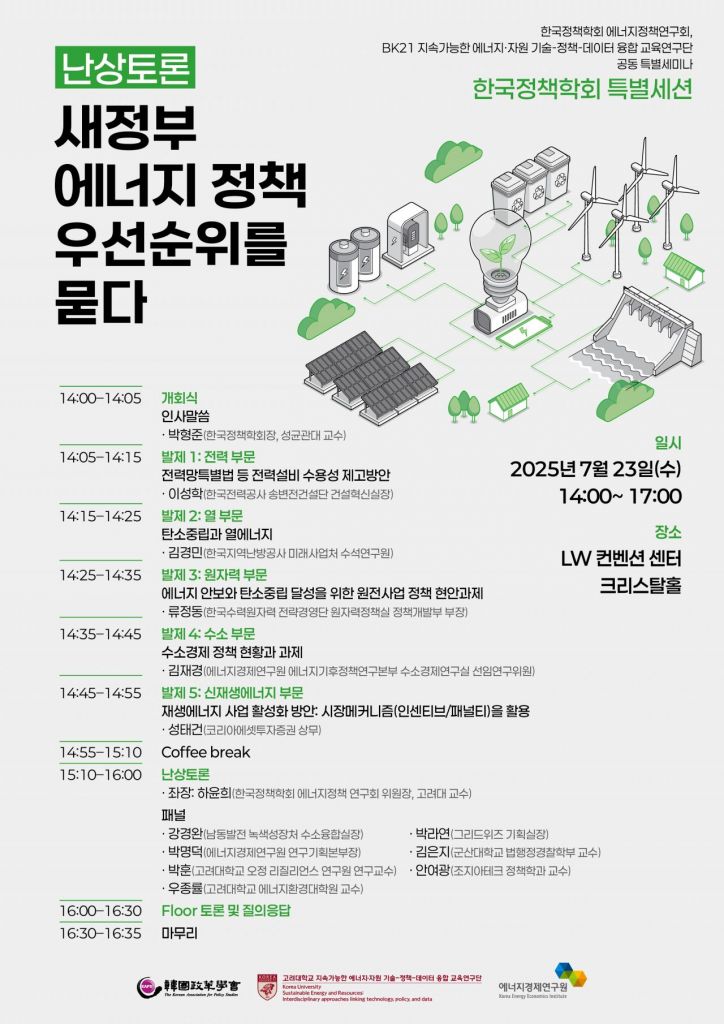 한국정책학회 에너지정책연구회는 고려대학교 지속가능한 에너지·자원 기술-정책-데이터 융합 교육연구단, 에너지경제연구원과 함께 23일 오후 2시 LW컨벤션센터 크리스탈홀에서 '난상토론: 새정부 에너지 정책, 우선순위를 묻다' 특별 세션을 개최한다고 밝혔다.