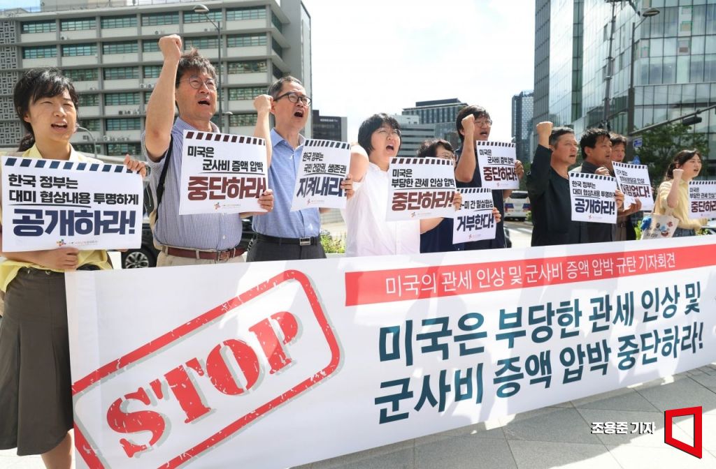 시민사회단체연대가 22일 서울 종로 광화문광장 미국대사관 건너편에서미국의 부당한 관세 인상 및 군사비 증액 압박 중단을 촉구하는 규탄 기자회견을 하고 있다.