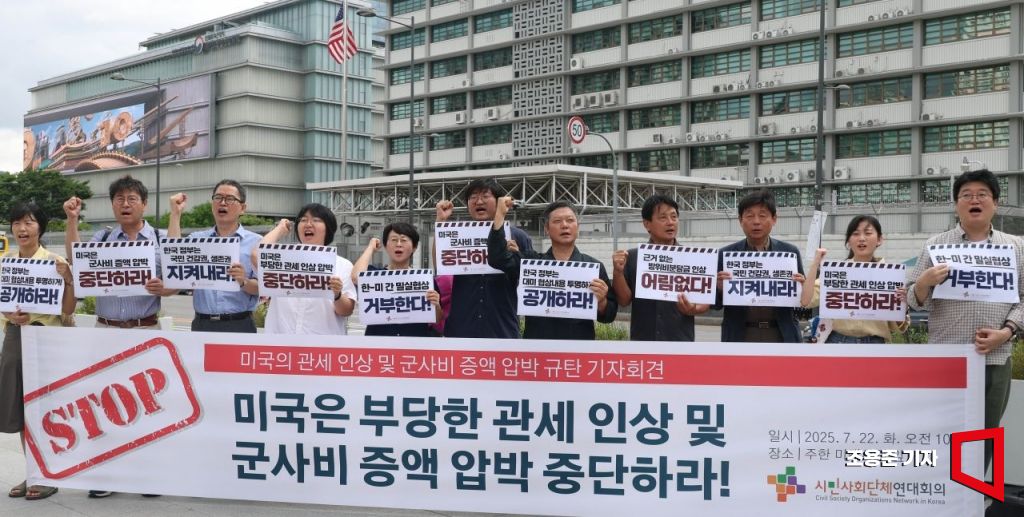 시민사회단체연대가 22일 서울 종로 광화문광장 미국대사관 건너편에서미국의 부당한 관세 인상 및 군사비 증액 압박 중단을 촉구하는 규탄 기자회견을 하고 있다.