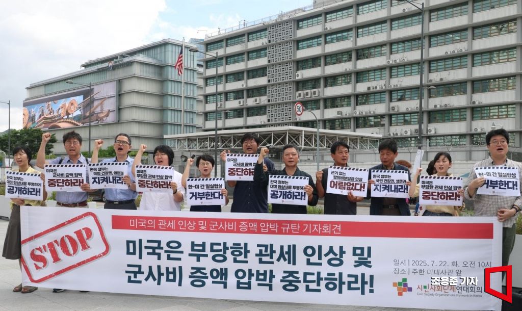 시민사회단체연대가 22일 서울 종로 광화문광장 미국대사관 건너편에서미국의 부당한 관세 인상 및 군사비 증액 압박 중단을 촉구하는 규탄 기자회견을 하고 있다.
