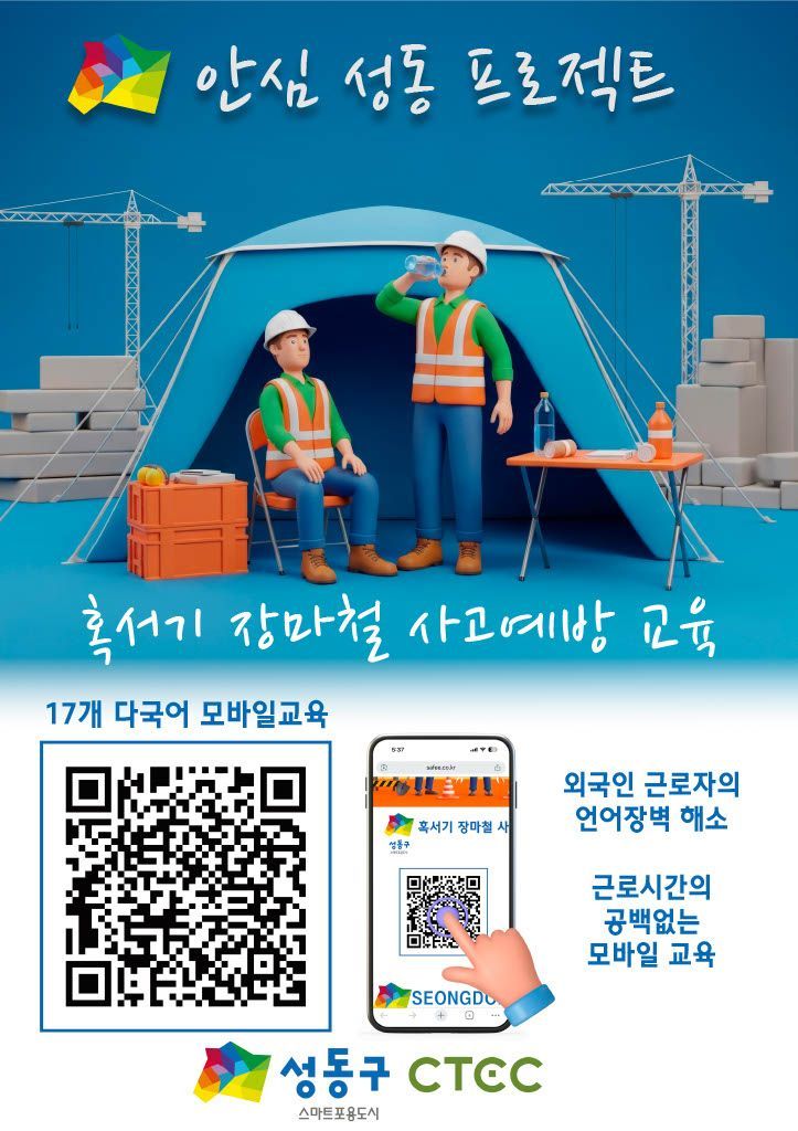 '안심 성동 프로젝트'를 통해 현장 근로자는 시간과 장소에 구애받지 않고 스마트폰으로 QR코드를 스캔해 안전교육 영상에 접속할 수 있다. 중국어, 베트남어, 몽골어, 영어 등 총 17개 언어로 제공돼 다양한 국적의 외국인 근로자도 불편 없이 교육받을 수 있다.