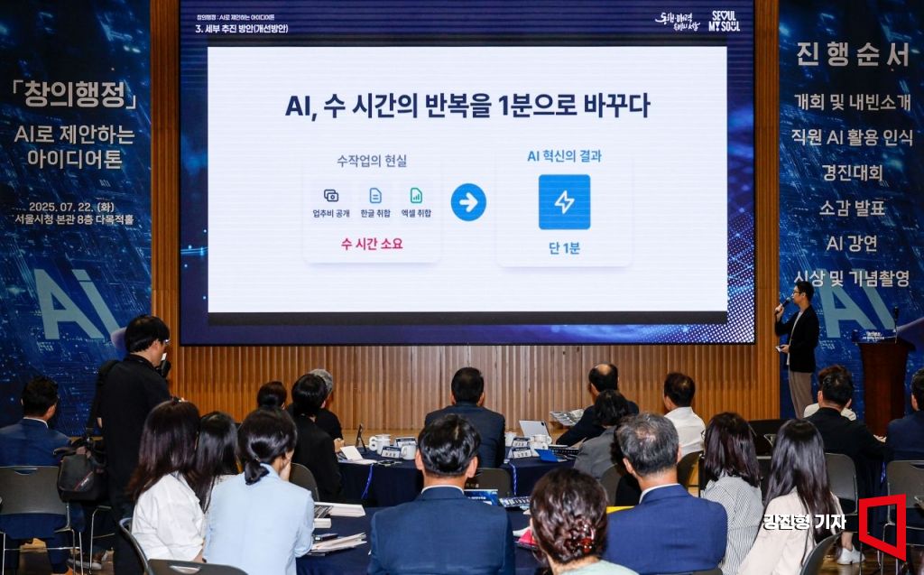 22일 서울 중구 서울시청에서 열린 'AI로 제안하는 창의 아이디어톤'에서 직원이 AI를 활용한 창의행정 발표를 하고 있다.