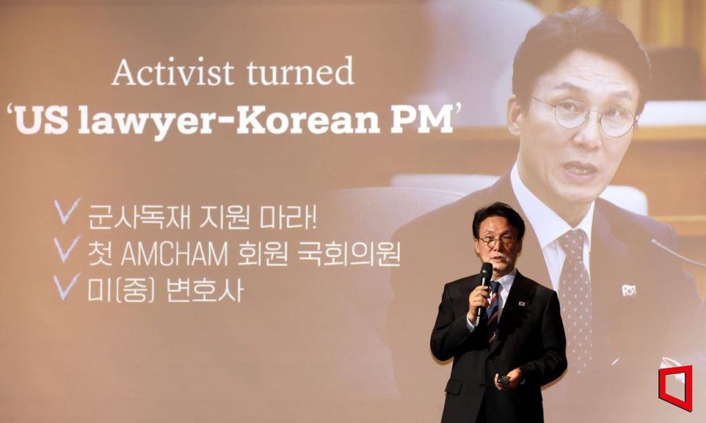 김민석 국무총리가 22일 서울 여의도 콘래드서울 호텔에서 열린 주한미국상공회의소(AMCHAM KOREA) 세미나에서 기조연설을 하고 있다. 청사사진기자단
