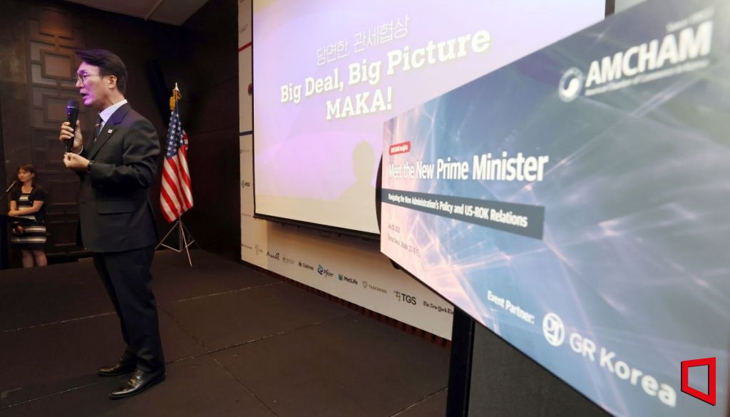 김민석 국무총리가 22일 서울 여의도 콘래드서울 호텔에서 열린 주한미국상공회의소(AMCHAM KOREA) 세미나에서 기조연설을 하고 있다. 청사사진기자단
