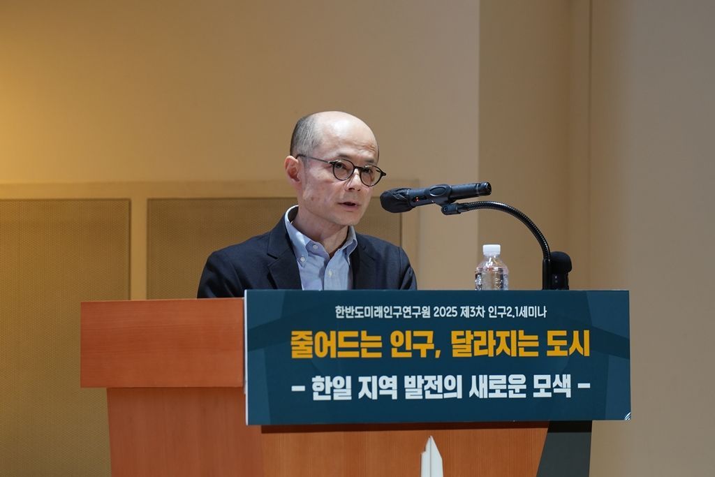 모리 토모야 일본 교토대학교 경제연구소 교수가 22일 한반도미래인구연구원이 개최한 '줄어드는 인구, 달라지는도시' 세미나에서 주제발표를 하고 있다. 한반도미래인구연구원
