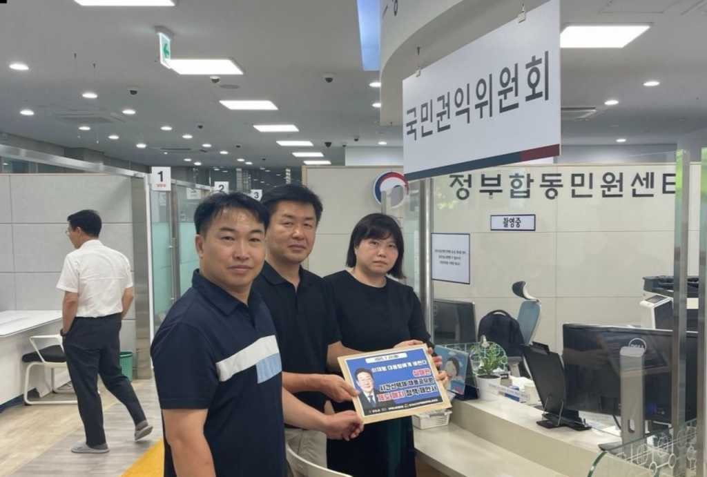 시간선택제노조 김진식 사무총장과 김정국 부위원장, 정성혜 위원장(왼쪽부터)이 22일 정부합동민원센터에 방문해 ‘실패한 시간선택제 채용공무원 제도 폐지 정책 제안서’를 전달하고 있다. 시간선택제노조 제공.