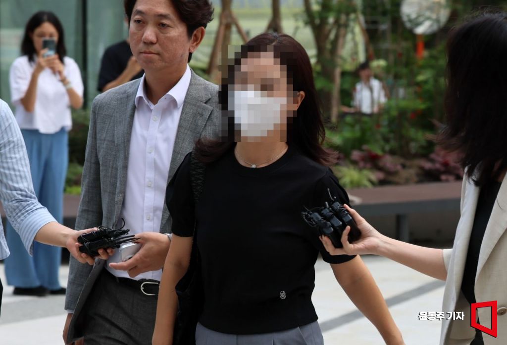 김건희 여사 일가의 집사로 알려진 김예성 씨 부인 정 모씨가 23일 서울 종로구 KT광화문빌딩 웨스트에 마련된 김건희 특검 사무실로 출석하고 있다.