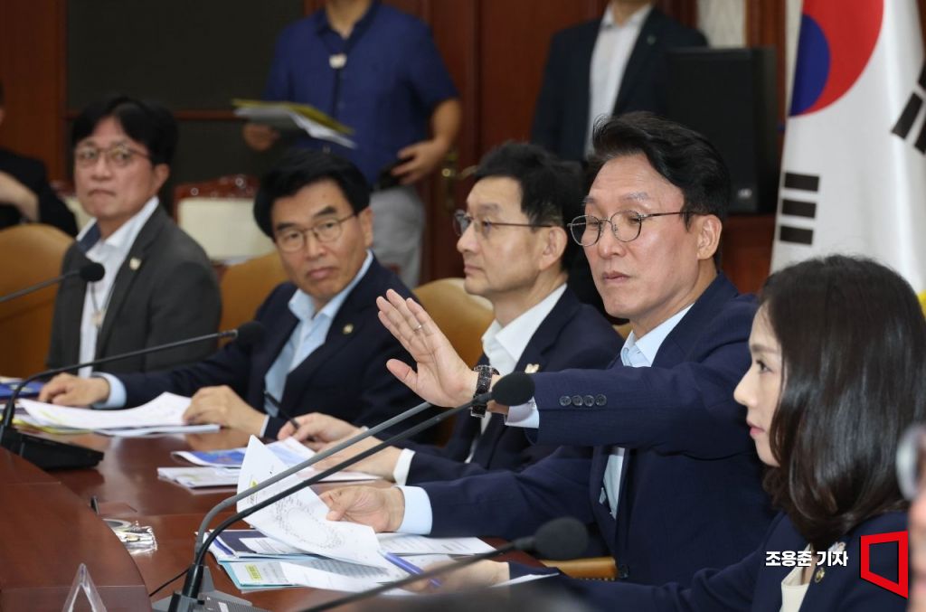 김민석 국무총리가 23일 서울 종로구 정부서울청사에서 기업인, 인프라 및 콘텐츠 분야별 전문가 등이 참석한 가운데 열린 APEC 점검 종합보고에서 시계를 보고 있다.