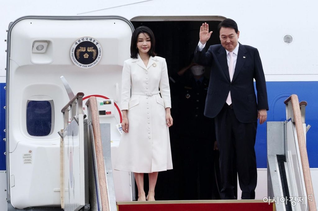 윤석열 전 대통령과 김건희 여사가 2022년 6월 27일 북대서양조약기구(NATO·나토) 정상회의 참석하기 위해 경기 성남 서울공항에서 전용기에 오르며 손을 흔들고 있다./성남=김현민 기자 kimhyun81@