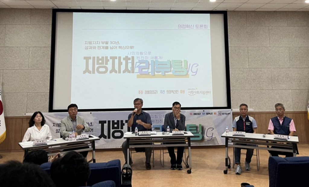 참여자치21과 의정혁신단은 23일 오전 광주시청 2층 무등홀에서 '지방자치 리부팅, 의정 혁신 1차 토론회'를 열고 지방정치의 위기 원인과 대안을 논의했다. 기조 발제와 토론에 나선 참석자들은 한목소리로 지방의회의 감시·견제 기능이 사실상 실종됐다며, 광주·전남 지역에서 반복되는 구조적 문제를 짚었다.