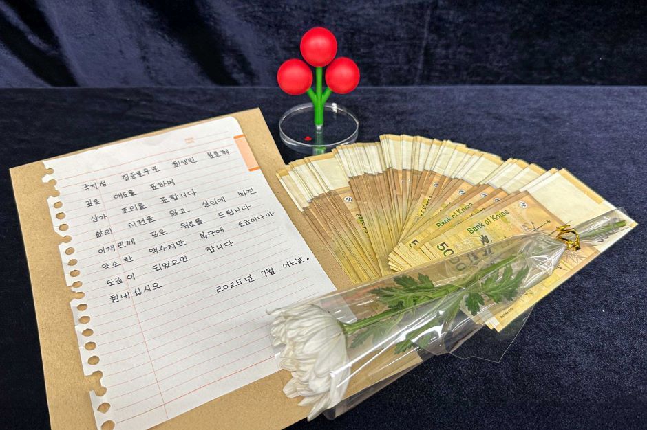 익명의 기부자인 '경남 나눔천사'가 전달한 상자 내 희생자를 추모하는 국화꽃 한 송이, 정성스럽게 눌러 쓴 손편지, 그리고 500만 원이 담긴 현금 봉투가 함께 담겨 있다. 경남 사랑의열매