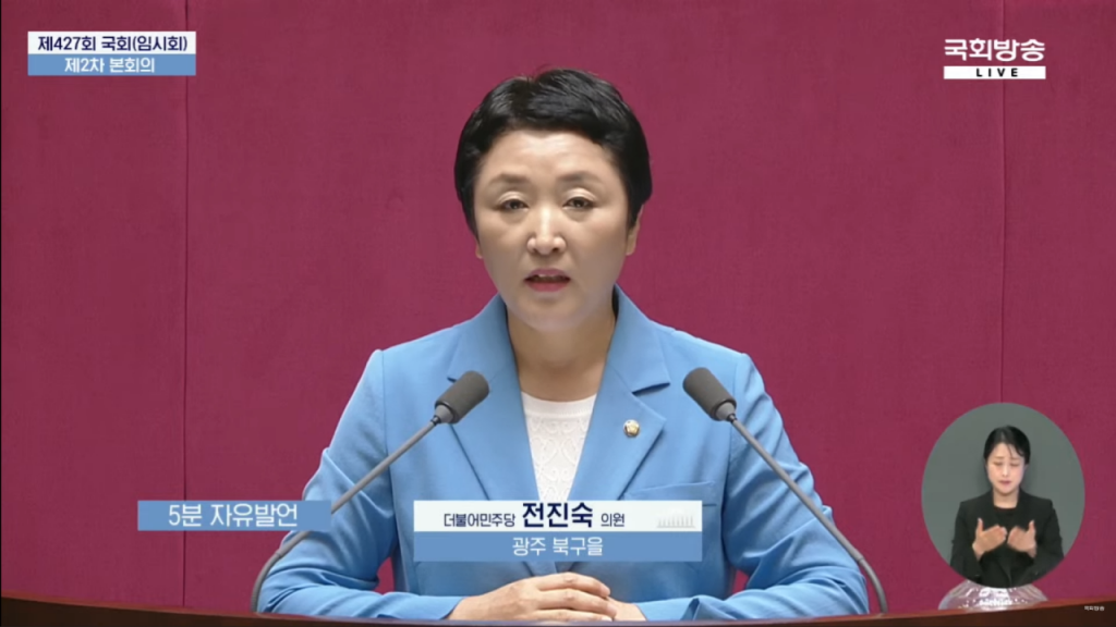전진숙 더불어민주당 의원이 23일 열린 국회 본회의에서 '5분 자유발언'을 통해 '광주시 특별재난지역' 선포를 주장하고 있다. 전진숙 의원실 제공