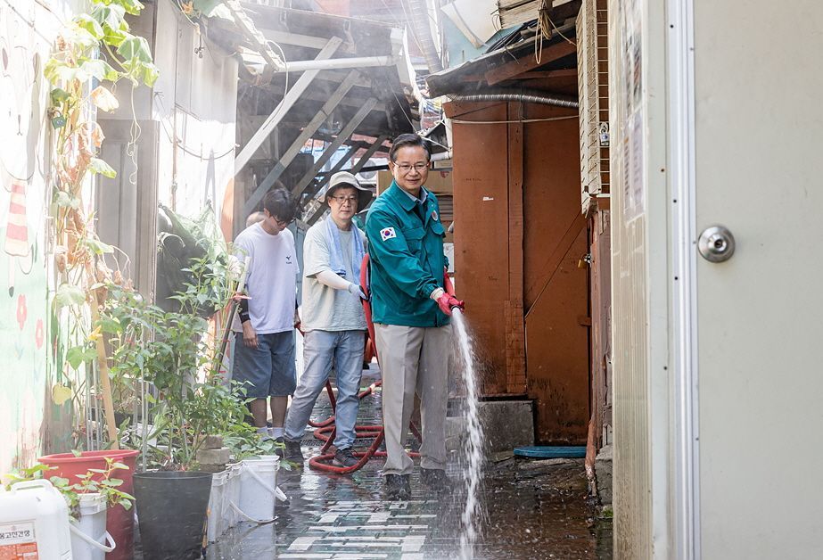 지난해 폭염대비 쪽방지역의 현장점검을 실시하고 있는 최호권 영등포구청장. 영등포구 제공.