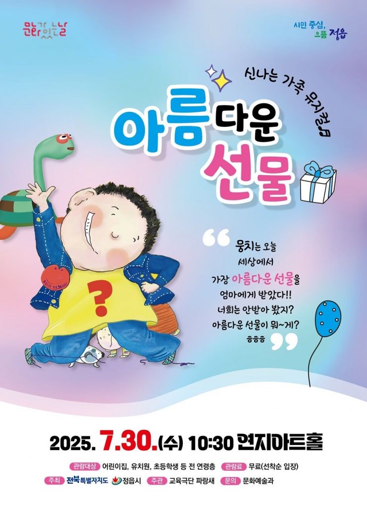 전북 정읍시가 문화가 있는 날을 맞아 오는 30일 오전 10시 30분 연지아트홀에서 가족뮤지컬 '아름다운 선물' 공연을 연다.