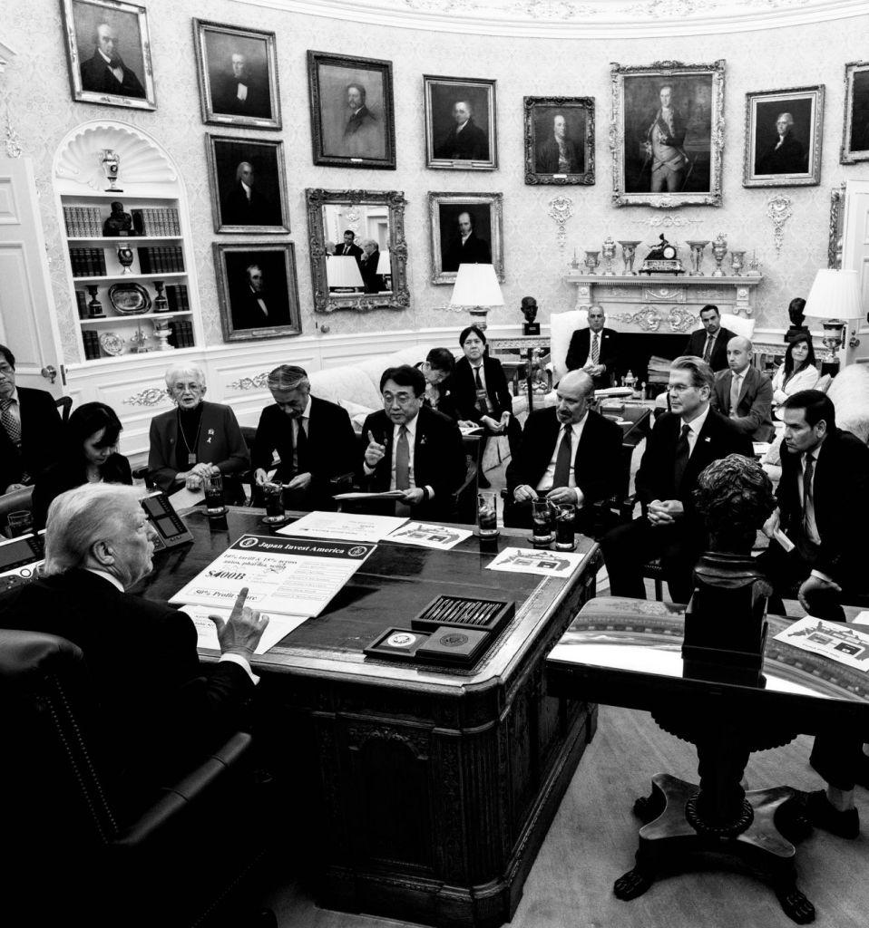 댄 스카비노 백악관 부비서실장이 지난 22일(현지시간) 사회관계망서비스 엑스(X)에 공개한 사진. 도널드 트럼프 미국 대통령이 일본 측 제안이 적힌 대형 보드를 책상 위에 펼쳐놓고 일본 측 관세 협상 대표인 아카자와 료세이 경제재생상과 직접 협상하고 있다. 스카비노 X