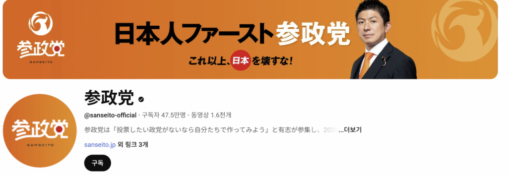 일본 참정당 유튜브 채널. 프로필에는 '일본 퍼스트 참정당', '이 이상으로 일본을 부수지 마라'라고 되어있다. 참정당 유튜브.