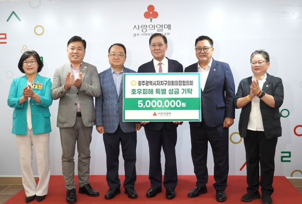 광주시 자치구의회 의장협의회가 집중호우로 피해를 입은 이재민들을 돕기 위해 특별성금 500만원을 기탁했다. 광주사회복지공동모금회 제공