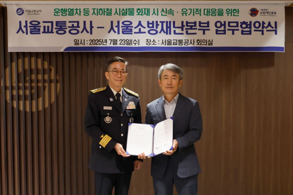 서울교통공사(사장 백호)는 23일 서울소방재난본부와 ‘운행 열차 등 지하철 시설물 화재 시 신속·유기적인 대응을 위한 업무협약’을 맺었다고 24일 밝혔다.