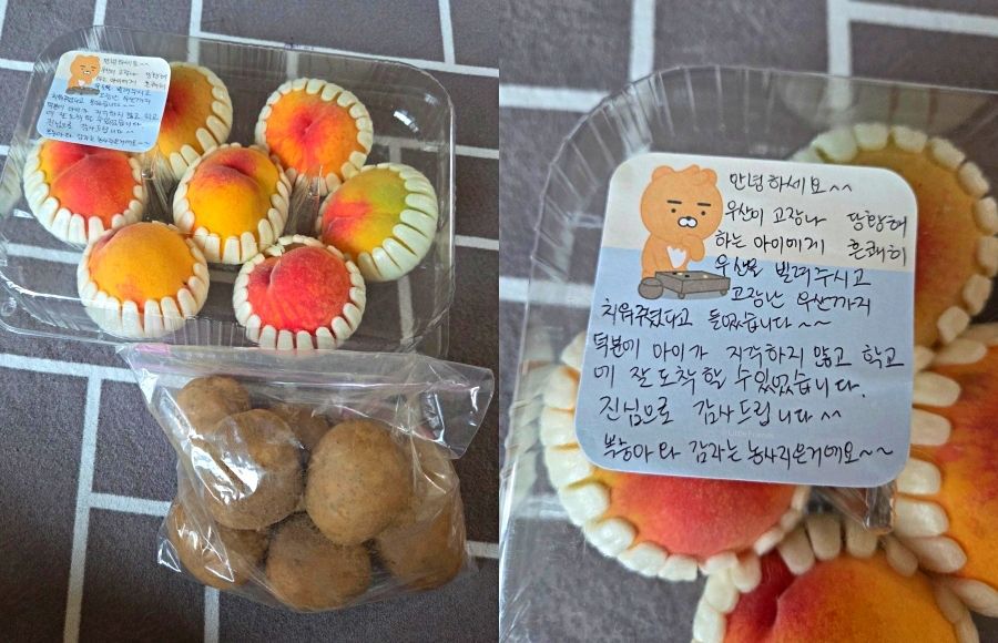 여고생 어머니가 문 앞에 두고 감자와 복숭아, 그리고 정성스럽게 빼곡히 적힌 손편지. 편지에는 우산을 빌려준 따뜻한 배려에 대한 고마움이 진심 어린 문장으로 담겨 있다. 온라인 커뮤니티