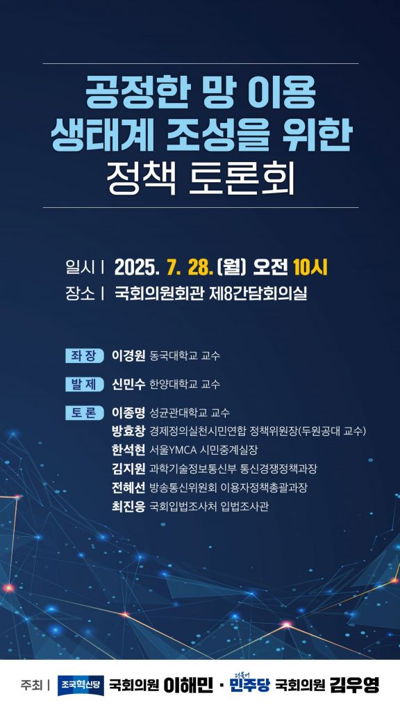 글로벌 콘텐츠사업자(CP)의 망 이용대가 부담 문제를 둘러싼 입법 논의가 본격화된다. 이해민 의원(조국혁신당)과 김우영 의원(더불어민주당)은 오는 28일 국회의원회관에서 '공정한 망 이용 생태계 조성을 위한 정책 토론회'를 공동 개최한다고 24일 밝혔다.
