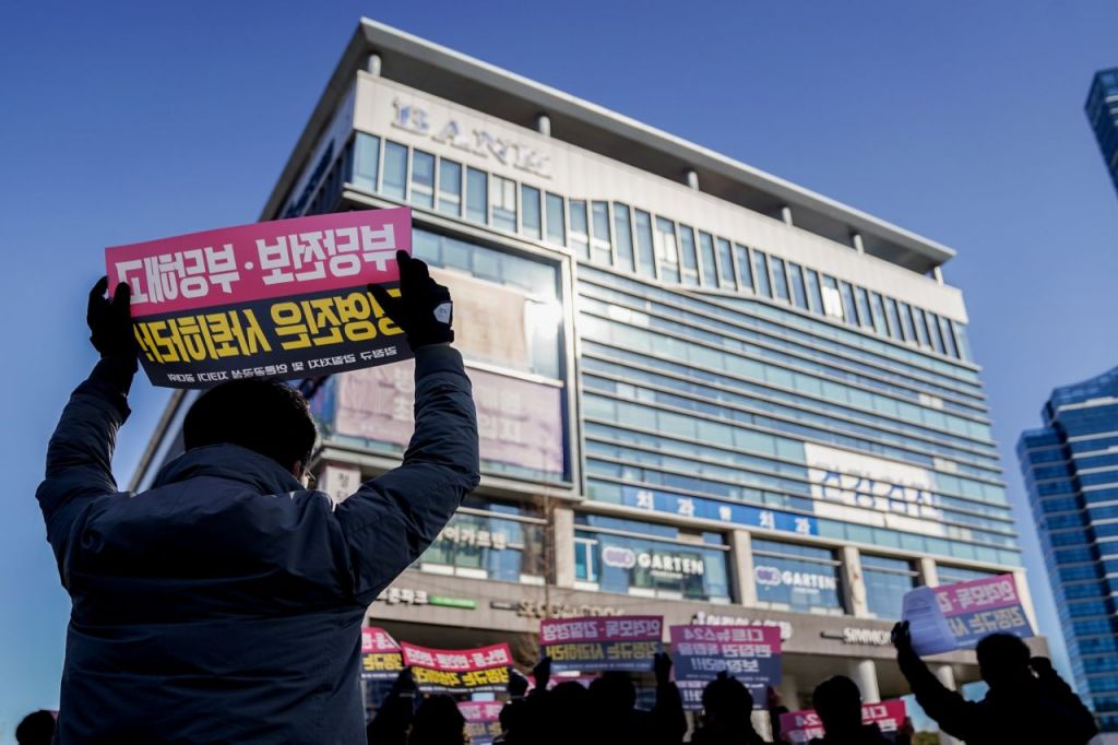 디트뉴스24 구성원들이 시민사회와 함께 타이어뱅크 사옥 앞에서 투쟁하는 장면.