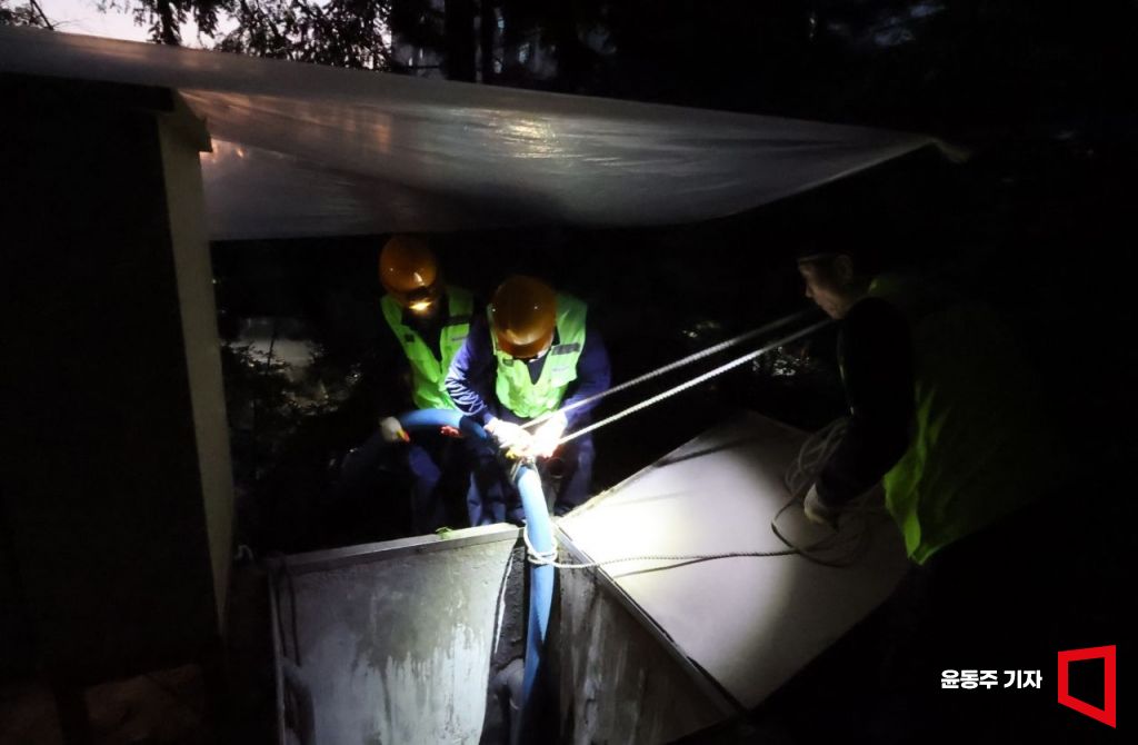 연일 체감온도가 35도 이상을 기록하고 있는 25일 이른 새벽에 서울 중구의 한 아파트에서 분뇨수거업체 작업자들이 무더위를 피해 이른 새벽에 작업을 하고 있다.