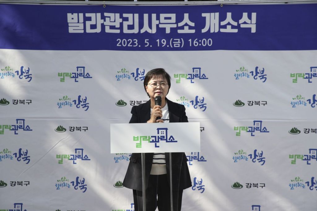 2023년 빌라관리사무소 개소식에서 이순희 강북구청장이 구민들에게 인사말을 전하고 있다. 강북구 제공.