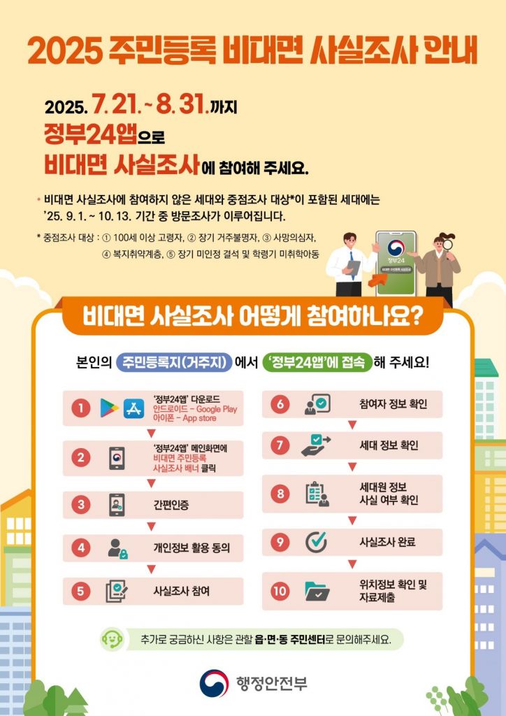 주민등록 사실조사는 주민등록지와 실거주지의 일치 여부를 조사하는 것으로, 비대면-디지털 조사(8월 31일까지)를 진행한 이후, 읍·면 합동조사반이 방문 조사(9월 1일~10월 23일)하는 방식으로 진행된다.