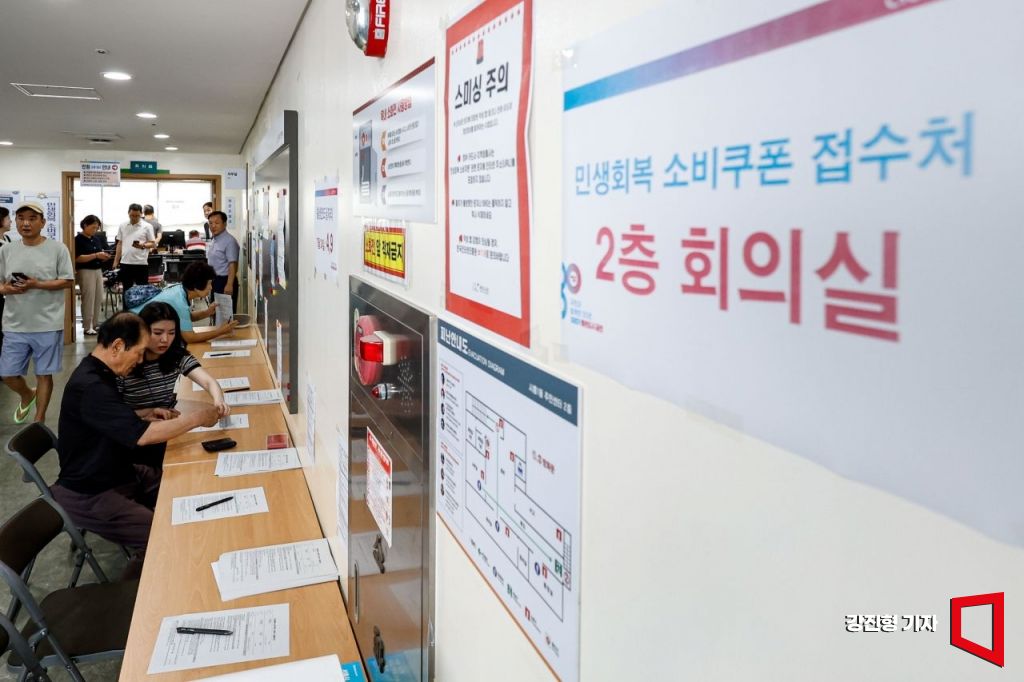 24일 서울 금천구 시흥1동 주민센터를 찾은 주민들이 민생회복 소비쿠폰을 신청하고 있다. 2025.7.24. 강진형 기자
