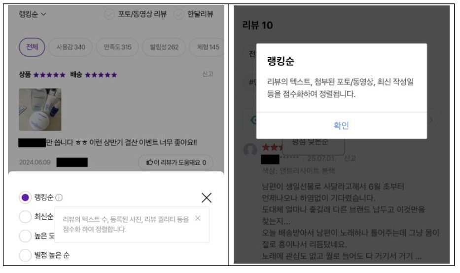 자체 알고리즘 정렬 방식은 리뷰 글자 수, 작성일, 평점, 사진 포함 여부 등 각각 기준이 달랐다. 다만 대부분 평점이 높거나 장점 위주로 묘사된 리뷰를 먼저 표시되는 것으로 나타났다.