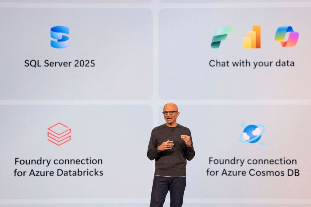 사티아 나델라 마이크로소프트(MS) 회장 겸 최고경영자(CEO)가 지난 5월 19일(현지시간) 워싱턴 시애틀의 MS 컨퍼런스에서 기조연설을 하고 있다. AFP연합뉴스