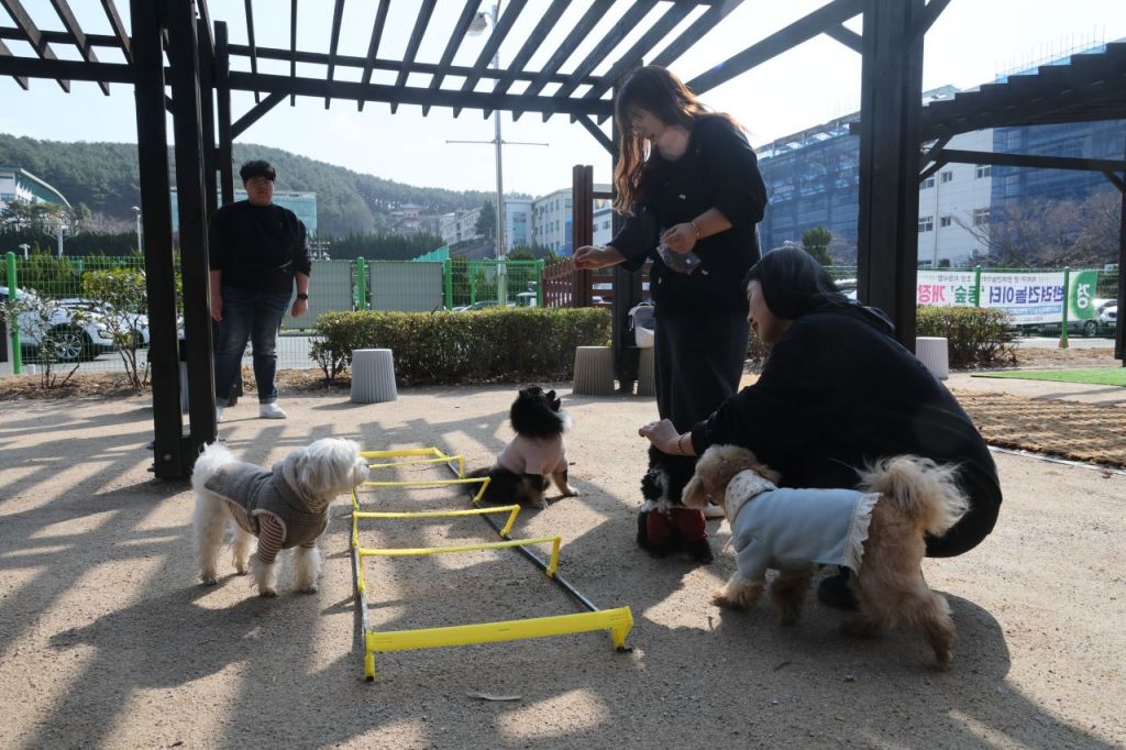 반려동물대학 학생들이 캠퍼스에서 반려동물들에게 학습시키고 있다.