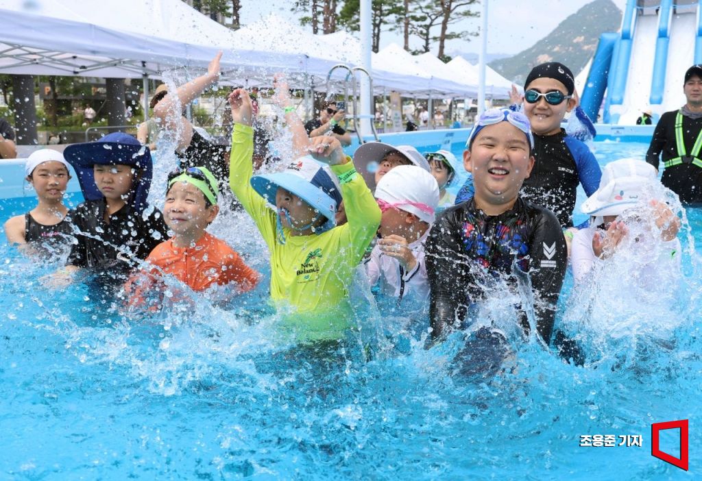 폭염이 기승을 부리며 서울 낮 최고기온이 영상 36도를 기록한 25일 서울 광화문에 마련된 '2025 서울 썸머비치 수영장'에서 아이들이 물놀이를 하며 더위를 식히고 있다.